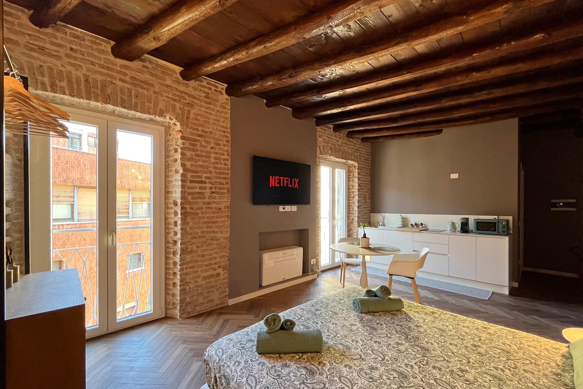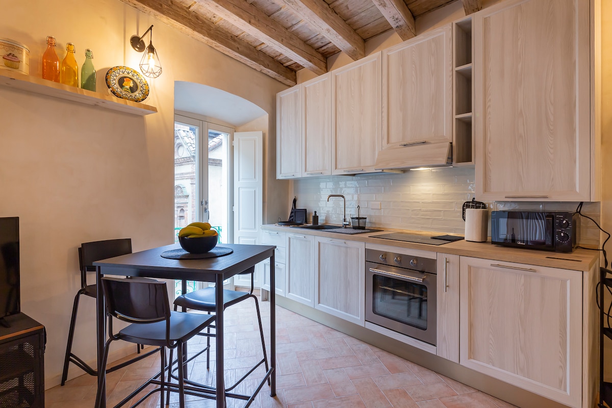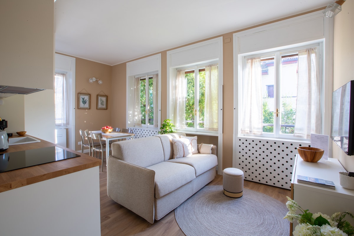 位于下贝加莫(Lower Bergamo)历史中心的一套经过全面翻修的精致公寓,最多可容纳 4 人。 它的设计旨在为您提供舒适放松的环境,由两个房间组成,房间被一扇华丽的玻璃窗隔开,并配有一个设备齐全的厨房、一张舒适的双人床、一张沙发床和一间带淋浴的浴室。 典雅的陈设与城市历史屋顶的壮丽景色相结合,将使您沉浸在意大利的卓越品味之中。