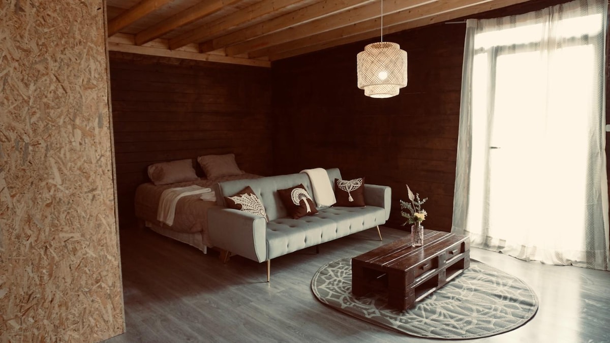 La cabaña se sitúa en un hermoso paraje, a solo 10 minutos de Santiago de Compostela, en la que pasar unos tranquilos y románticos días rodeados de naturaleza al lado del río Ulla, en un nuevo concepto de turismo rural. Con capacidad para 2 personas* en 27 funcionales m2, repartidos en baño, dormitorio, cocina, zona de estar, sofá cama, TV, Wi-Fi, aire acondicionado y una terraza exterior bajo abedules, hayas, fresnos….