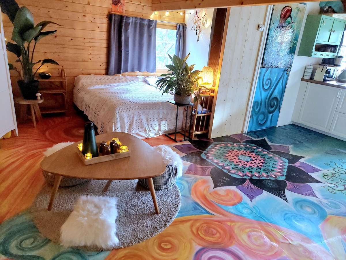 Ons geliefde huisje is een uniek kunstobject met handgeschilderde vloer. Deze unieke schilderij van cca 30m2 symboliseert alle 5 elementen. Badkamer heeft ook zijn eigen schilderij aan de tegels en aan de deur (water element). Alle vaste schilderijen zijn beschermd door lagen van epoxy. De kunst geeft een unieke energetische dimensie aan het huisje. Naast verhuur voor overnachting wordt het huisje ook als een healing praktijk gebruikt en voor verschillende circles en ceremonies.