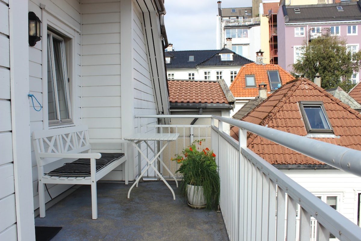 Cozy and spacious apartment on the top floor, smack in the middle of Bergen, in the pleasant neighbourhood Nøstet. Two patios; one for the morning sun with a charming view of the wooden house environment, the other for the afternoon sun. 4th floor (no lift), 6 min. walk to Torgallmenningen. Playground right outside the house, and bakery and grocery store 2 minutes away.