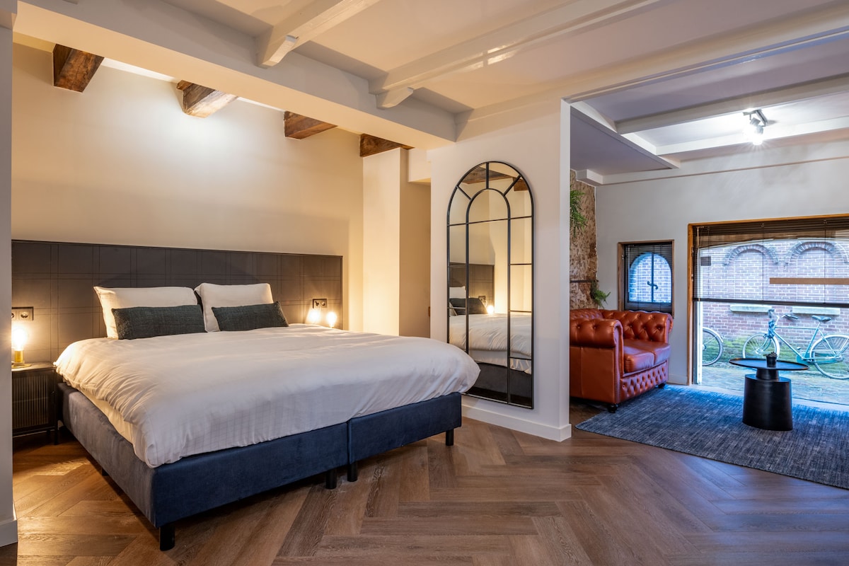 De Loft stijl brengt de rauwe charme van een pakhuis met industriële elementen naar de hotelkamer. Stenen muren, plafondbalken en metalen accenten zorgen voor een stoere en avontuurlijke sfeer. Het gebruik van natuurlijke materialen, zoals ruw hout en leer, draagt bij aan de warmte en gezelligheid van de ruimte. Deze stijl is perfect voor gasten die op zoek zijn naar een moderne, stedelijke ontsnapping met een vleugje industriële flair. Kom je ook slapen in hartje Alkmaar?