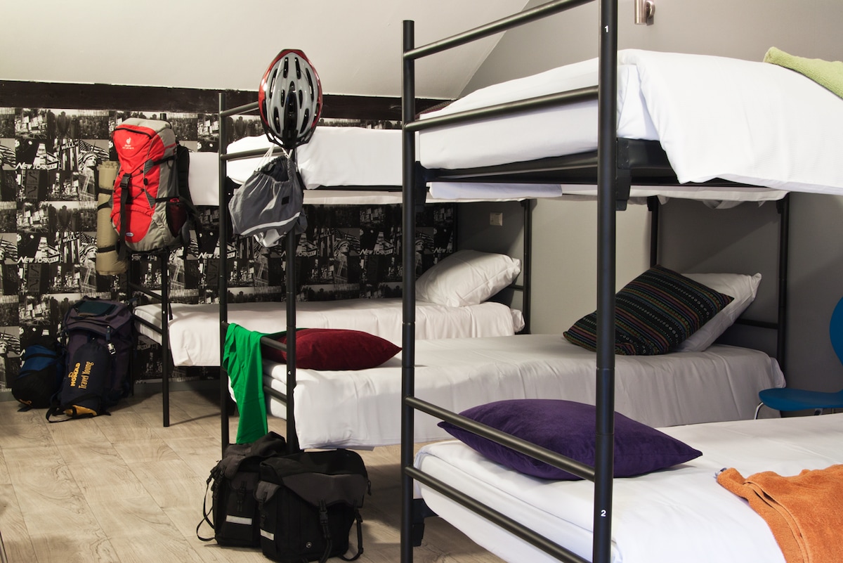 Welkom in onze levendige jongerenkamer, speciaal ontworpen voor reizigers tot 35 jaar! Perfect voor solo-reizigers of vriendengroepen die op zoek zijn naar een dynamische, sociale hostelervaring. De 9 persoons-kamer heeft een eigen badkamer met een douche en toilet, een kledingkast en een zitgedeelte. Kluisjes zijn beschikbaar in de gemeenschappelijke ruimte; neem je eigen hangslot mee of huur er een voor €5. Let op: Alle dorm kamers hebben geen ramen.