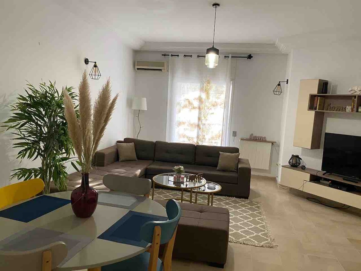 Détendez vous dans ce logement calme et cosy, luxueusement équipé et avec un décor harmonieux assurant un séjour agréable. L’appartement est situé dans une zone résidentielle calme, comprend un salon avec un canapé-lit , une chambre à coucher avec balcon et une Kitchenette bien équipée. 📍Niché à proximité de toutes les commodités: Carrefour, restaurants, cafés, lounges, salle de sport, pharmacie… L’aéroport de Tunis Carthage est à 5 minutes.