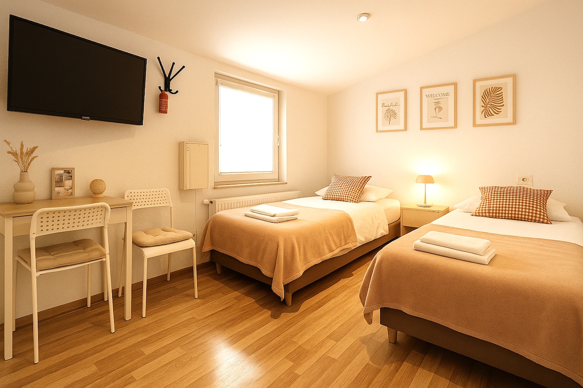 The COZY Double offers an intimate 18 sqm of sleek, modern design. The room features a comfortable double bed (with separate mattresses) or two single beds upon request, along with a private bathroom equipped with either a bathtub or shower. Enjoy essential amenities like a flatscreen TV, air conditioning, a partial work desk, and complimentary Wi-Fi. Please note that €3 per person per night city tourist tax is not included in the Airbnb price and must be paid directly to the hotel.