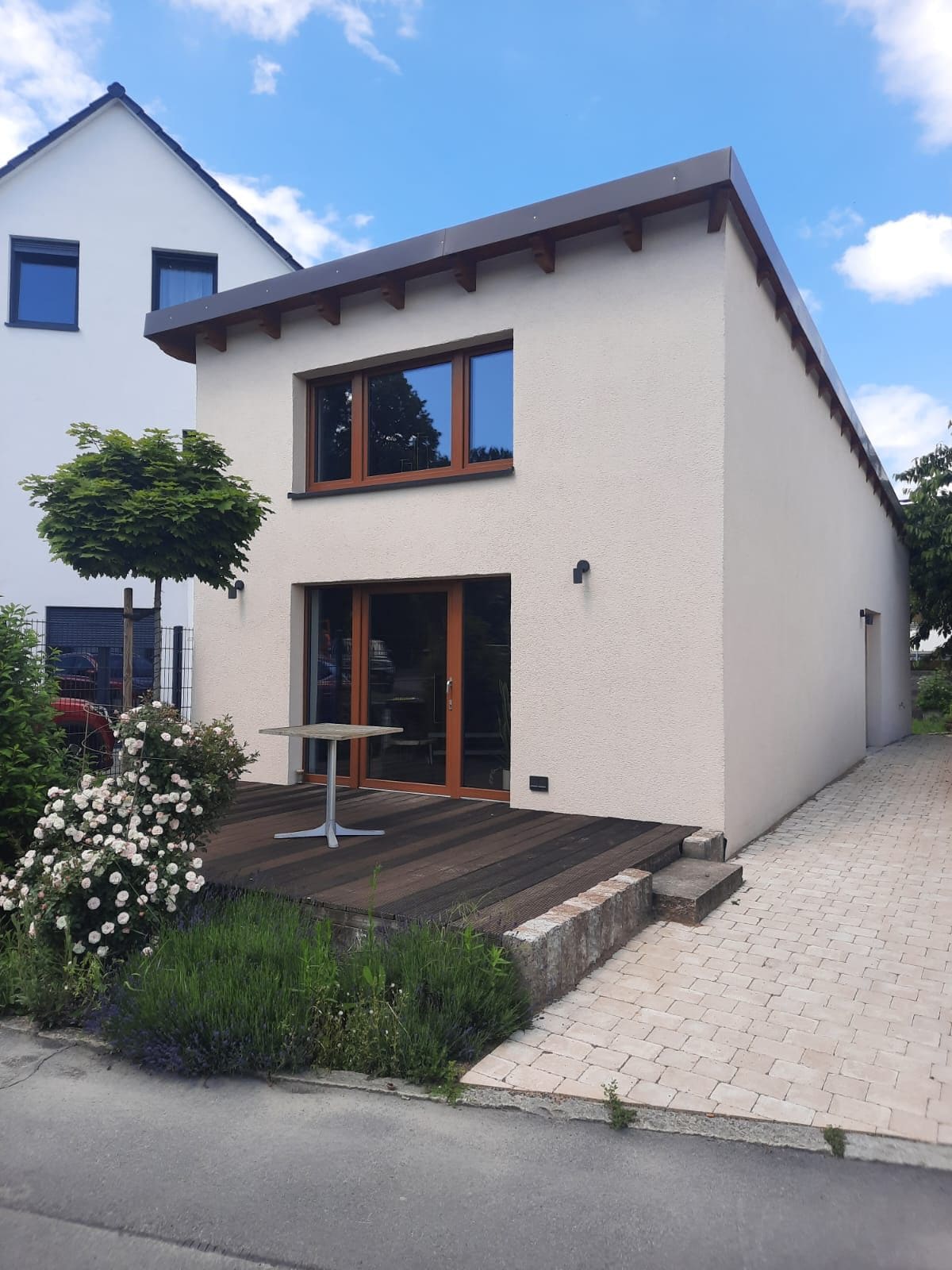Das von unserem Wohnhaus unabhängige Häuschen (wir wohnen auf demselben Grundstück) besteht aus zwei Zimmern und einem Bad. In dem Wohnraum mit kleiner Couch und Esstisch befindet sich auch eine kleine Küchenzeile mit 2 Platten Herd, Geschirr, Kaffemaschine (Senseo), Mikrowelle usw. Das Bett im Schlafzimmer hat die Größe 160x200. Als Verbindung zwischen den beiden Zimmern liegt das Duschbad. Ein Parkplatz ist direkt vor dem Häuschen.