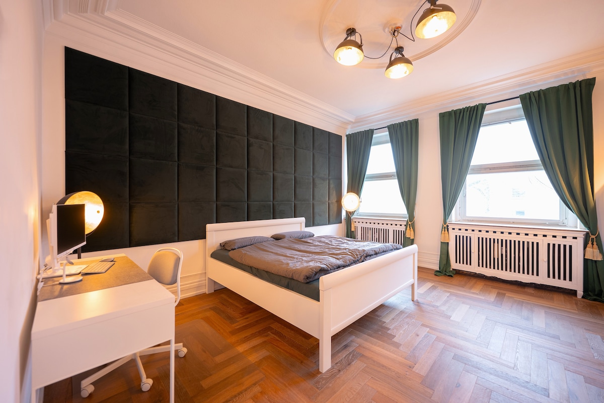 Einzigartige, 86 qm2 große, Architektenwohnung im prachtvollen Altbau mit 4 m Deckenhöhe, Stuck und edlem Herrenparkett. Designermöbel treffen auf den Charme eines historischen Herrenhauses. Zentral gelegen, nur 5 Min. zu Fuß ins lebendige Luisenviertel mit Bars und Shops, 10 Min. zur Innenstadt, 15 Min. zum Hbf. Ideal für Gäste, die das gewisse Etwas suchen – elegant, urban, besonders.