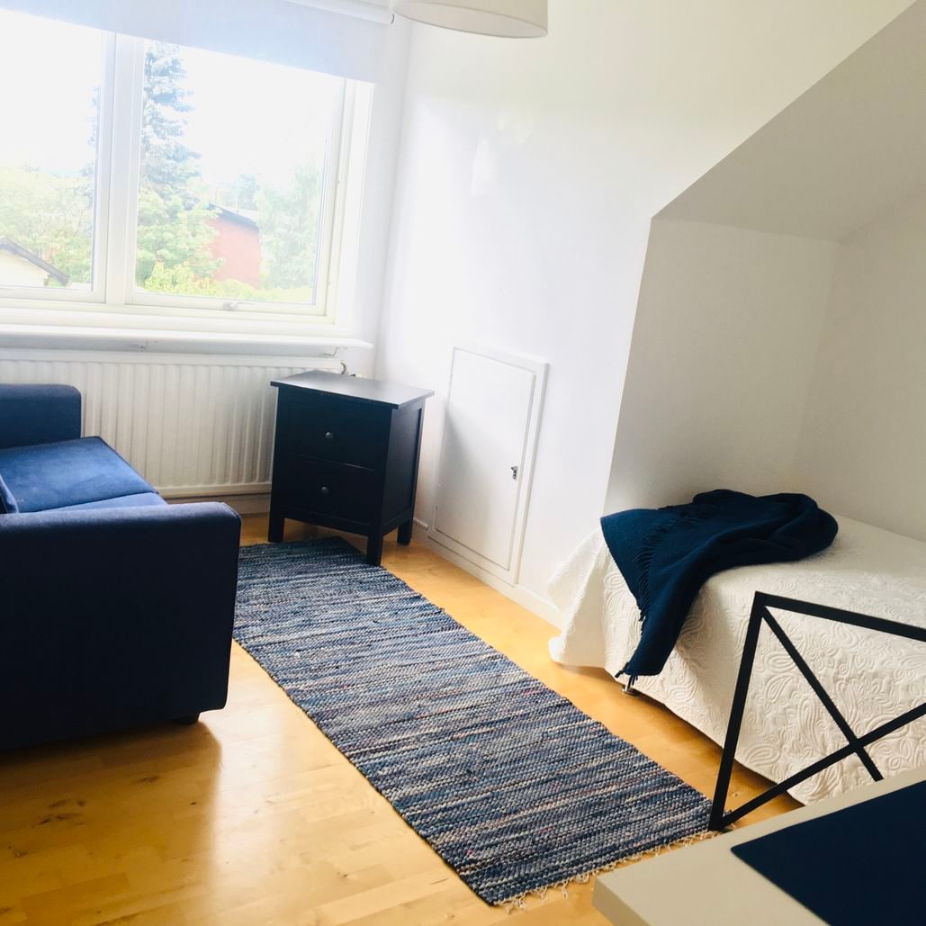 Gäststuga på ca15 kvadrat med pentry och liten toalett. Tillgång till stor altan med sol hela dagen. Gäststugan ligger på vår tomt med möjlighet till parkering. Dusch och tvättstuga finns i bostadshuset med egen ingång i källaren. Goda kommunikationer in till Göteborg via buss eller tåg. I vår trädgård vistas våra katter och höns.