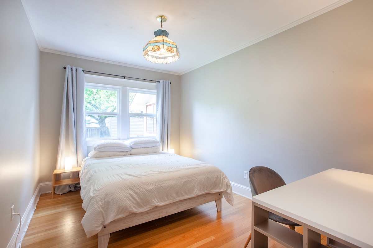 Comfortable, well lit upstairs living area over our home. Currently we have 2 bedrooms available, plus a full bath with corner shower, sitting area, dining table, microwave, full size fridge. Windows look out onto a quiet neighborhood, backyard and gardens. Located near the heart of Newberg's rich downtown district, close to parks, coffee shops, beer and wine tasting, farm to table restaurants, antique stores, movie theater, grocery store and Cultural Center. Garden-fresh breakfast included.