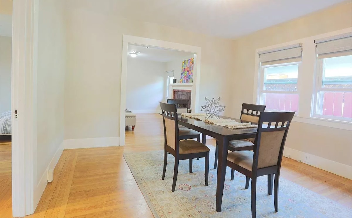 Welcome to our 1906 Traditional Style Home in Poet's corner; includes a gourmet kitchen, deck, yard, dining room, living room boasting a full wood pocket door that closes off the entire room w/ a queen sofa bed, a private king room + ensuite bathroom, & guest room w/ queen & single. Comfortably sleeps 7. Near BART, 4th street district shops, bus lines, restaurants & cafes, all walkable. The home is snuggled back behind two homes off the street providing a quiet oasis from city life.