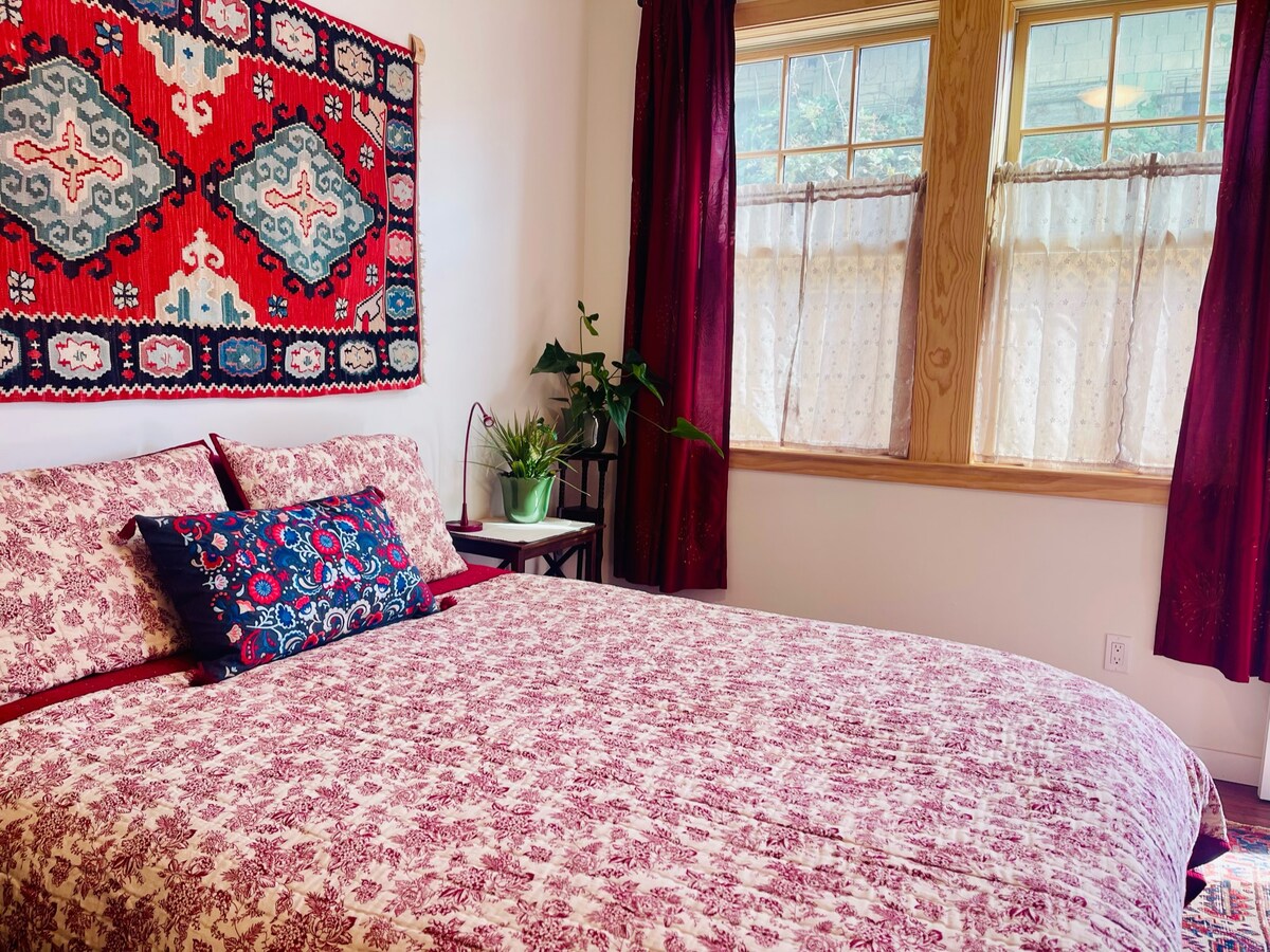 Be our guests in our comfy, sun-filled studio guest house in Berkeley. Our studio is small but mighty, with all of the amenities you'll need on your trip. We have a brand new queen bed, a loveseat sitting area, a table and chairs for getting work done, a full kitchen and bathroom, plenty of natural light, and an outdoor sitting area on a deck. You'll also have a private entrance, and because we use electronic code locks, you won't need to pick up any keys. And, there is an on-site parking!