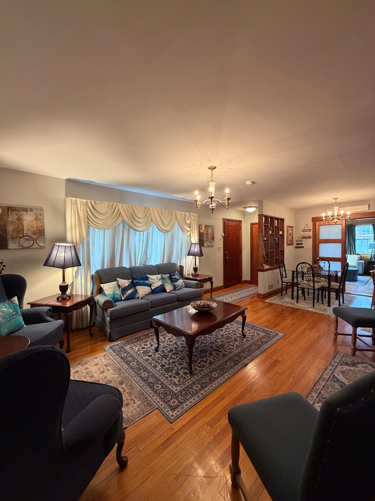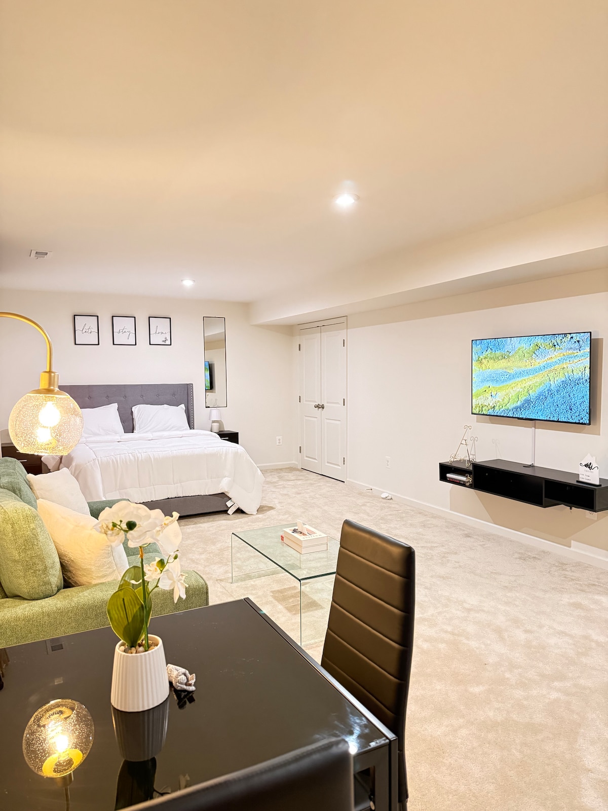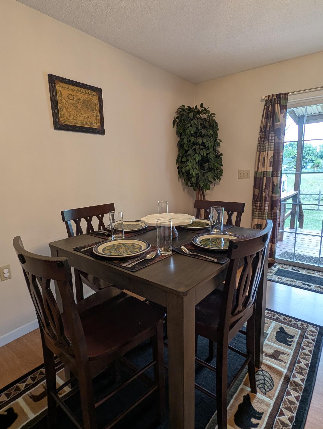 Ground level two room unit. No steps. Separate entrance from main house. Private entrance and parking. There is an entrance room with a double bed, twin bed, sofa and full refrig.. In a separate living area, there is a queen bed, TV, bathroom, desk, table, microwave, convection oven, air fryer, gas fireplace. No oven. Outside there is a large area to use outdoor gas grill, picnic table and fire pit. Dogs allowed and must be kept on a leash when outside. Please NO CATS. The owner is allergic