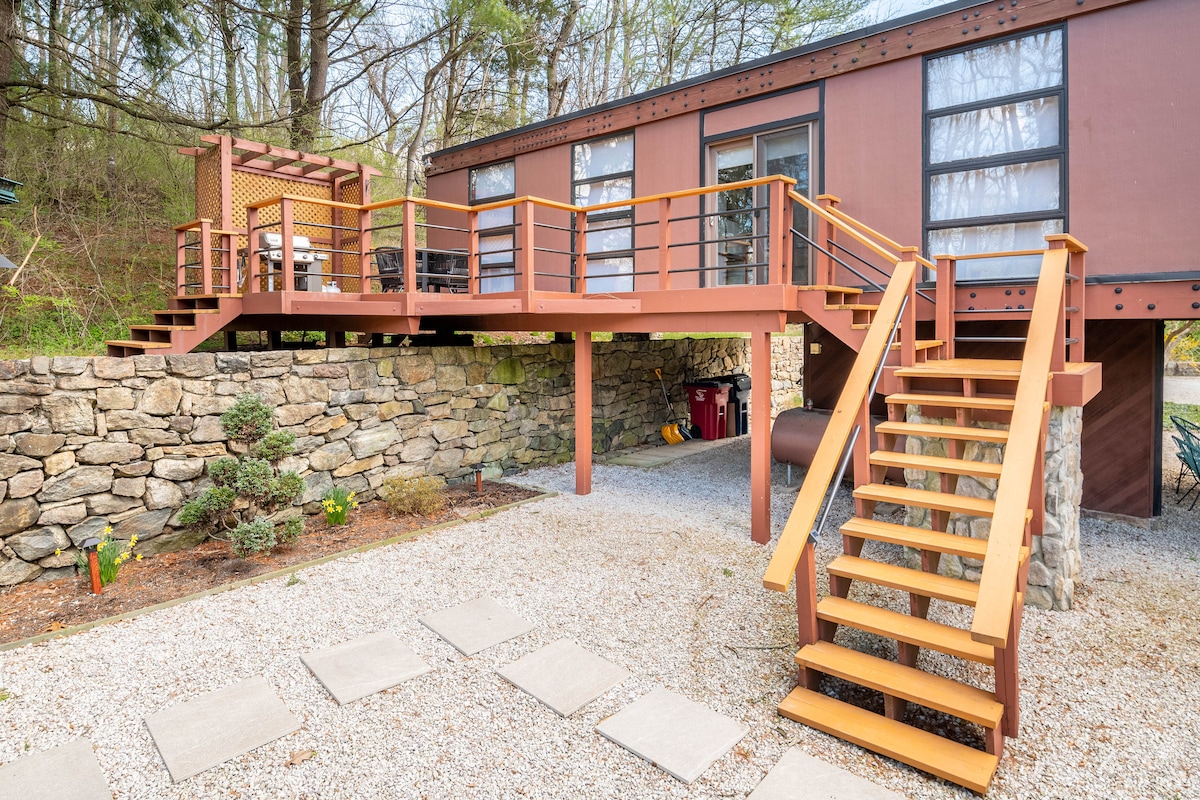 This one of a kind mid-century modern home sits above a peaceful mountain stream located in Wernersville Pa. The home has two bedroom, bathroom with walk-in shower and combined dining/living room with a cozy modern fireplace and a 60" 4K tv. Relax year around in the large outdoor hot tub while listening to the sounds of the peaceful creek and birds singing. A short 10-20 minute drive you'll find hiking trails, shopping and most any restaurant you can imagine. Hershey Park & Amish Country 45min