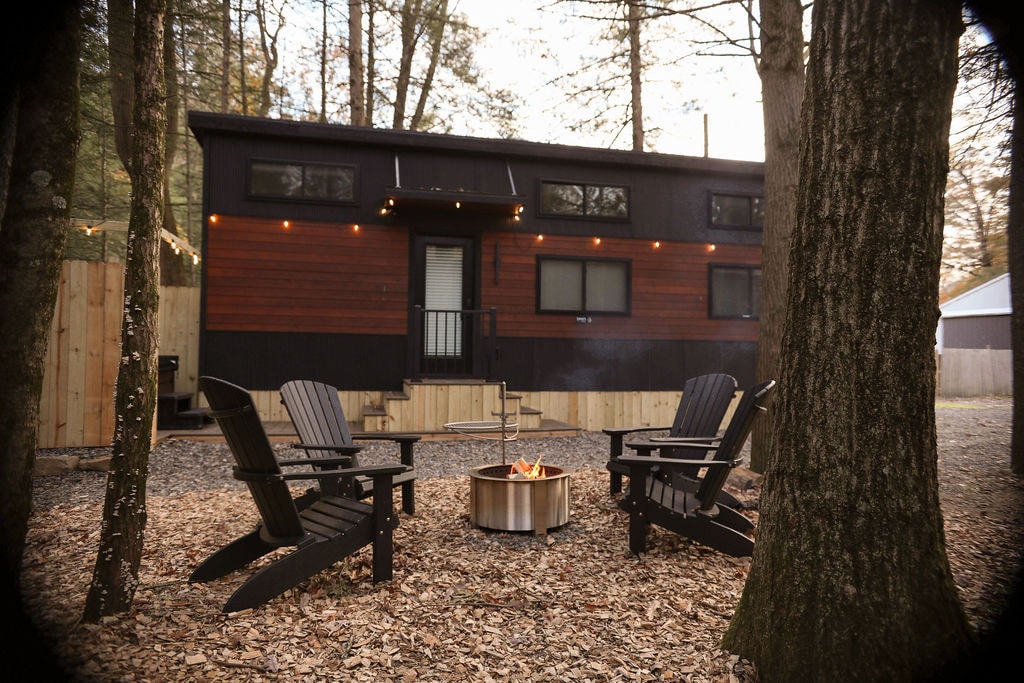 Enjoy the lovely setting of this romantic spot in nature. Enjoy some quiet time as you sit on the porch and listen to the Little Black Creek or relax in a Shared hot tub! This modern and spacious tiny home is the place for you! Whether your looking to spend some quiet time with your partner or getting away with some friends. The tiny home is fully stocked with all the modern amenities needed to make your stay a memorable one.