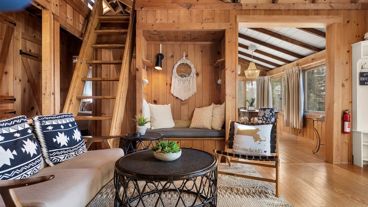 Welcome to our stylish glamping cabin! Relax in the spacious yard & sunny deck. Cozy fieldstone fireplace, vaulted ceilings & skylights. The cottage features gorgeous pine wood & fantastic interior design. Unwind in the reading nook, master bedroom with skylights, or put on your favorite vinyl. Kids will adore the sleeping loft. Just a 9-minute walk or 2-minute drive to the public beach (the beautiful Stockbridge Bowl). BBQ grill, outdoor fire pit . Tanglewood is just minutes away.