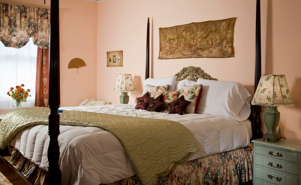 Known as the Rarus Room, this moody and romantic second-floor space features a Queen bed, corner gas fireplace, and private bath with a Jacuzzi tub. Located in the Carriage House of our historic property, it offers privacy and is a short walk to downtown Lenox. Enjoy daily full breakfast, A/C, HDTV, Wi-Fi, and access to our heated pool (seasonal, Memorial Day - Labor Day). Professionally managed by Hampton Terrace Inn.
