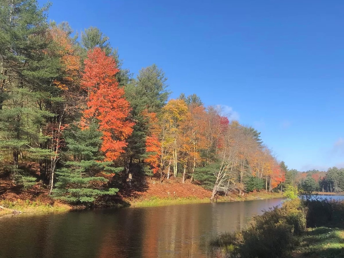 THE BERKSHIRES COTTAGE IN THE WOODS BY A SPRING FED LAKE HAS SOMETHING FOR EVERYONE....... SWIM, FISH, KAYAK, HIKE, SKI, JACOBS PILLOW DANCE FESTIVALS, TANGLEWOOD OUTDOOR CONCERTS, GOLF, DINE, SHOP LEE OUTLETS, DINE WITH ENTERTAINMENT, PLAYS, ANTIQUES, FIRE PITS, HANGING IN A HAMMOCK, FLOAT ON CRYSTAL CLEAR WATER, BBQ ON THE DECK, OR JUST DOING NOTHING AT ALL UNPLUG AND RECHARGE. ESCAPE & RELAX. (90 second walk through wooded path to lake) Pets Considered. Approved pet = approved Pet Agreement.