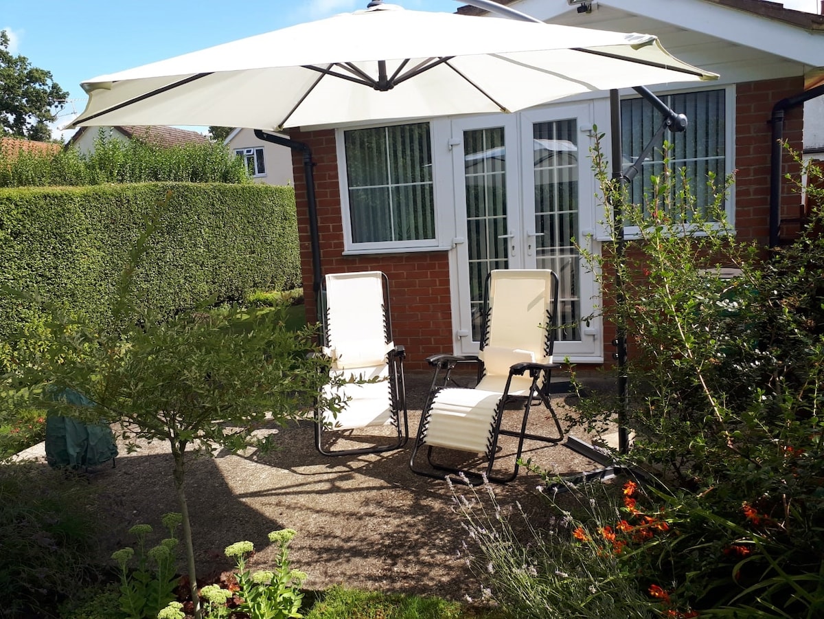 A lovely indendant apartment at the bottom of our garden secluded by trees . the apartment has a nice outside area with patio table and chairs . Inside there is a large open plan kitchen , dinner, lounge with a sofa bed and a well equipped kitchen with double oven , fridge freezer , dishwhaser , whashing machine microwave , toaster, kettle and much more . theres a large smart tv and wifi , dinning table . bedroom with king size bed and built-in wardrobe . bathroom with walk-in shower .