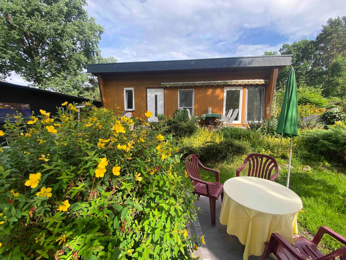 Wir bieten einen kleinen gemütlichen und liebevoll eingerichteten Bungalow mit Garten für max. 3 Personen an. Der Bungalow verfügt über ein Schlafzimmer mit Doppelbett (1,40 m breit) und hat im Wohnzimmer eine Couch mit Schlaffunktion wo eine weitere Person schlafen könnte. Der Bungalow liegt in ruhiger ländlicher Umgebung am Stadtrand von Berlin.