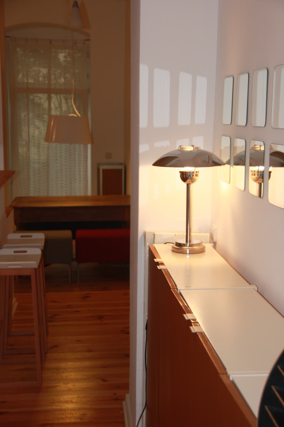 Originally designed and planned as a showroom / meeting room . The idea was to built a place to discuss, meet and represent. Reason for the location which is great to reach anything in this fast growing City of Berlin. The space and atmosphere have a happy synergy and a work / life balance for itself. I love it here - it is usually my office . We have 2 big flat screen TV screens with Amazon Prime, Netflix a sound system with Spotify and an open fire place to calm down.