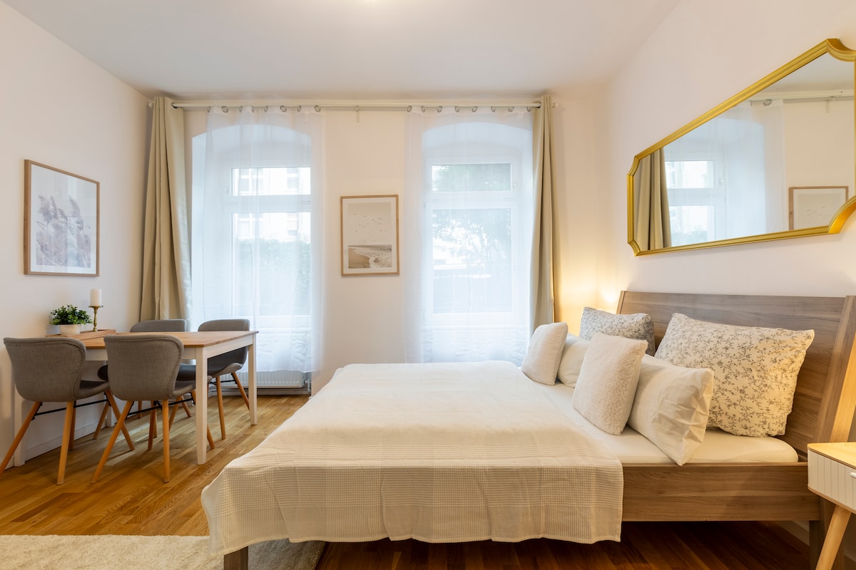 Welcome to our modern studio, perfectly located between Gleisdreieck Park and Potsdamer Straße. The fully equipped kitchen, a spacious 180x220 cm bed, underfloor heating, and a modern bathroom with a rain shower provide everything you need for a comfortable stay. Relax on the sunny loggia and enjoy the tranquility. Prime location with excellent transport connections. Cafés, restaurants, and markets are within walking distance—perfect for exploring Berlin!