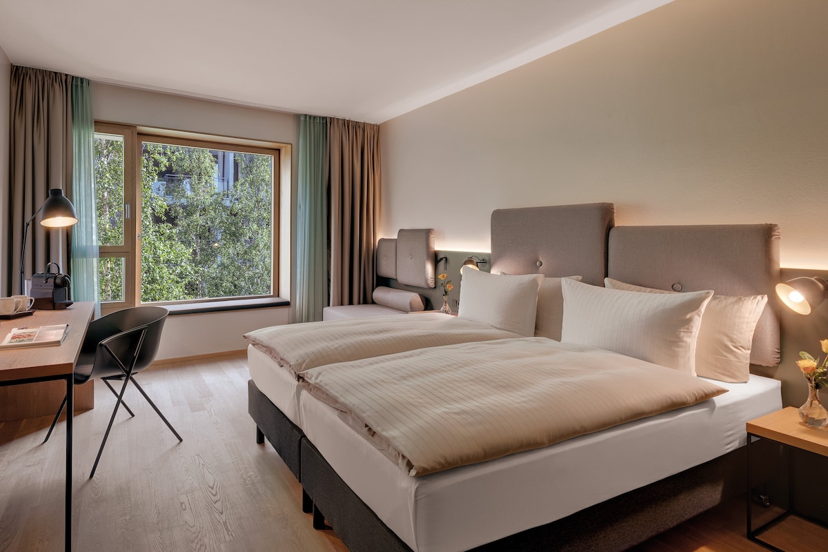 ca. 17m² | 140/160*200cm oder 2 Betten à 90*200cm (getrennt oder zusammenstehend) | Schreibtisch | Flachbildfernseher | gratis WLAN | Bad mit Dusche/WC und Haartrockner | Safe & Kühlschrank im Zimmer Parkplatz: bitte vorab reservieren für 19,00€ pro Tag. Frühstück: Buffet mit einer großen Auswahl an regionalen und BIO Produkten für 21,00€, Mo.-Fr. von 06:30 Uhr-10:30 Uhr, am Wochenende & an Feiertagen 07:00 Uhr-11:00 Uhr, Tee- und Kaffeespezialitäten sowie Säfte sind inklusive
