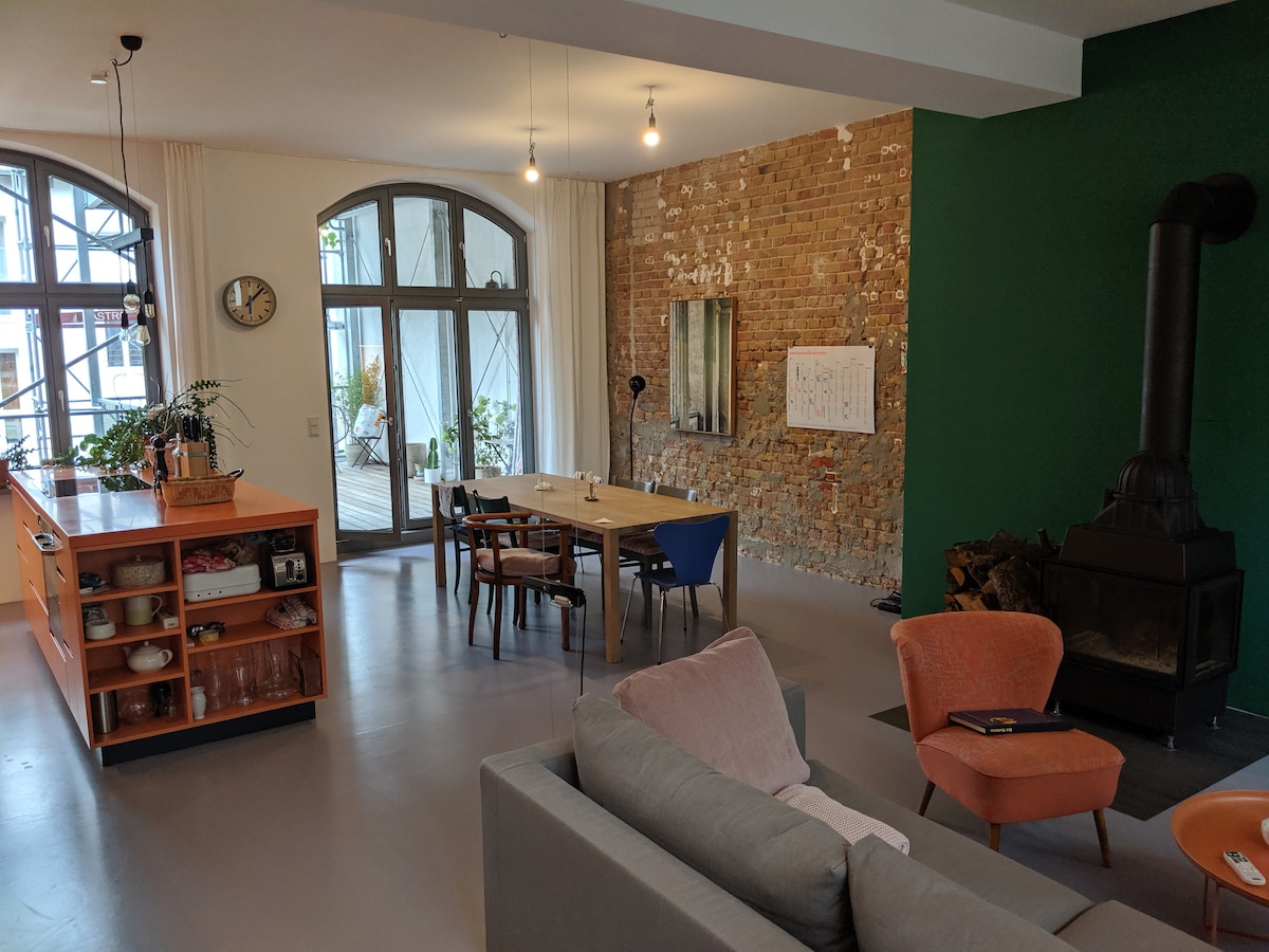 Originally designed and planned as a showroom / meeting room . The idea was to built a place to discuss, meet and represent. Reason for the location which is great to reach anything in this fast growing City of Berlin. The space and atmosphere have a happy synergy and a work / life balance for itself. I love it here - it is usually my office . We have 2 big flat screen TV screens with Amazon Prime, Netflix a sound system with Spotify and an open fire place to calm down.