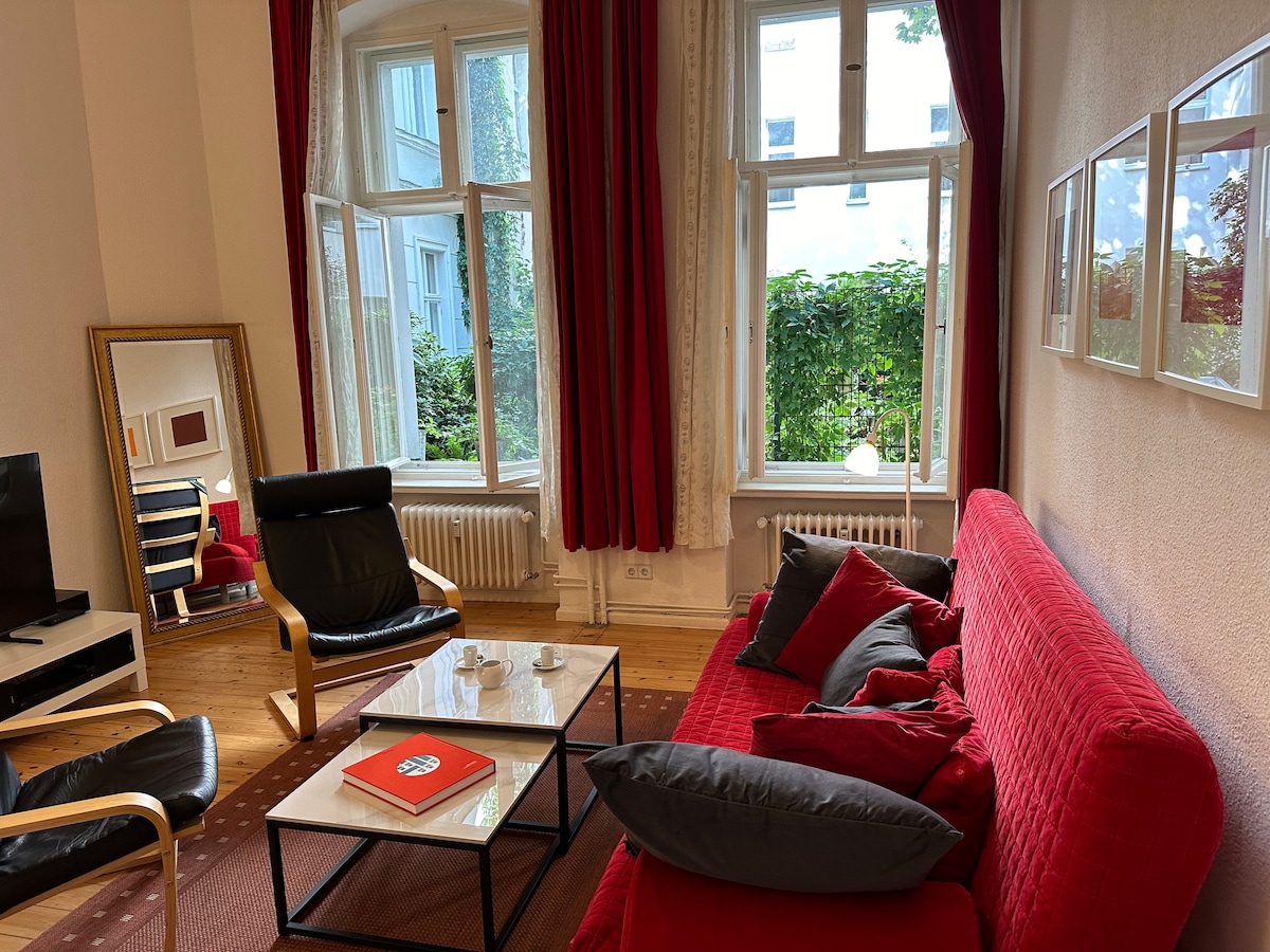Our apt (90sqm / 1.000sqft) is in a 1893 historical building with 2 bedrooms (1 double, 1 triple), 2 bathrooms, fully-equipped kitchen and living room. Centrally located in Prenzlauer Berg, Berlin's most beautiful area, in a quiet street with nice restaurants, cafés and lots of green! Netflix is available on both TVs, as well as a fast internet connection (250Mb/s), washing machine and Nespresso machine with capsules selection.