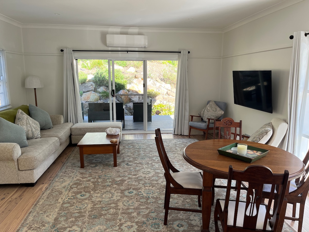 Spring, and the whales are heading south. Watch whales in the bay, dolphins and sea eagles from the sun drenched lounge room . 'Clifftop' is a special 1960's Retro house right above beautiful Tathra Beach with stunning views of the coast and ocean High cyprus pine ceilings, retro fittings, sunny aspect and shelter from prevailing winds give Clifftop its unique style leaving guests with lasting memories.. Clifftop is lovingly maintained by us (Chris and Bruce) to make your stay special.