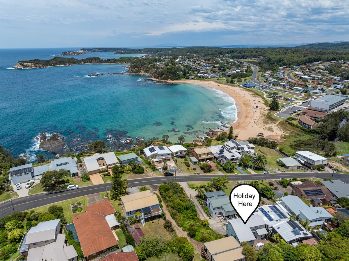 Beach front property at Rosedale on NSW south coast. Directly overlooking exclusive Nuns Beach accessible from a private path from the yard to the beach, the property is set next to state forest with echidna. Cutlery and crockery for 12 is provided in a full kitchen with cookware and coffee machine. Internal dining table seats 10 with outdoor table for 8-10, gas barbecue and sun lounges. Set in a serene setting, the 2700 sqm yard is secluded with no proximate neighbours. Pet friendly.