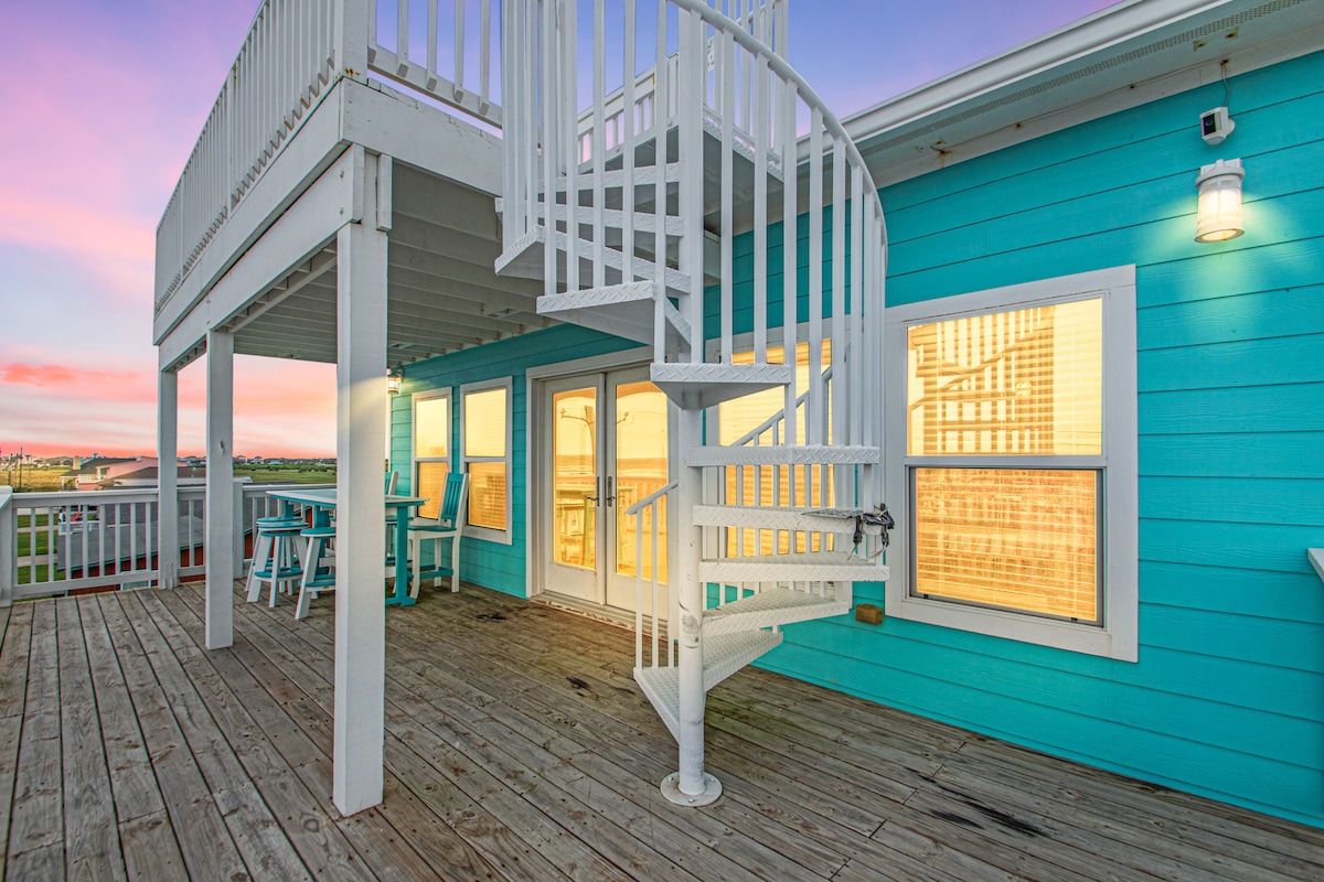 Hasta La Vista! Kick back and relax in this calm, stylish beachside home. Sit out on the deck with your coffee and listen to the songs of the shorebirds and soothing lull of the ocean. Grill up some good times on ground level. Have a delicious cocktail on the patio while playing cornhole. Make sweet s'mores at the fire pit. Take a quick 3-5 minute 1-block walk to the beach without having to dodge traffic or cross a major street. Enjoy all the history and charm of Galveston Island!
