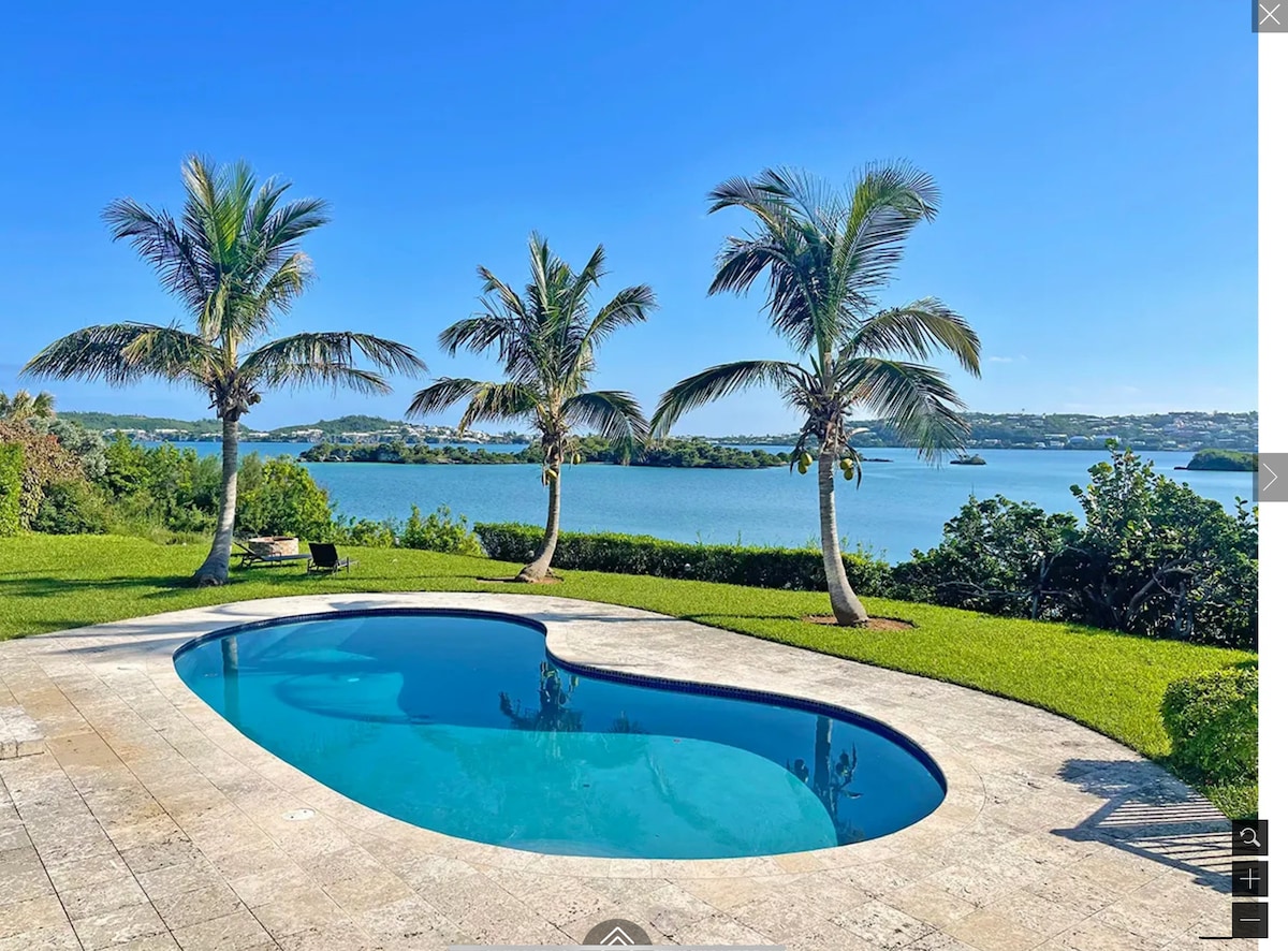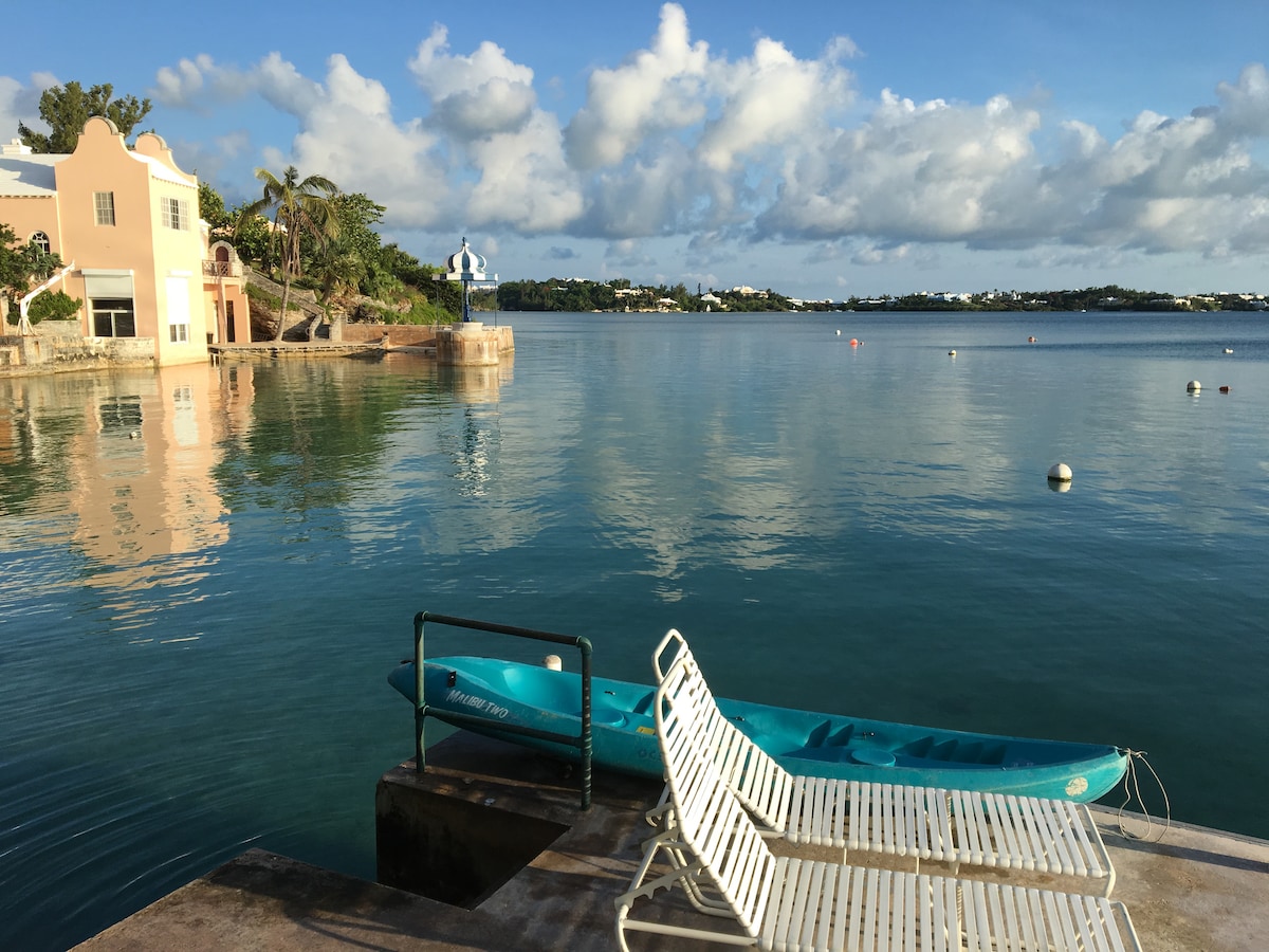 Cozy & compact, this delightful 1 bedroom/2 story waterfront hideaway affords a panoramic view of the Little & Great Sounds. On the water (walk across the lawn and jump in) with a large dock suitable for swimming, snorkeling & spectacular sunsets. "Sea Breeze Mews" is only a 10 minute walk to picturesque Church Bay beach & a short bus ride to all the magnificent South Shore Beaches. Restaurants and award winning Golf courses are only a few minutes away. Public transportation right outside gate.