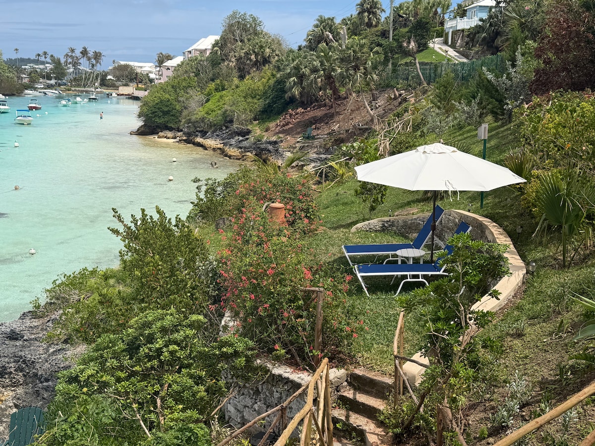 Tranquil one bedroom apartment perched on the water's edge overlooking Flatts Inlet. Relax on the porch, observing sea birds and marine life up close. Swim, snorkel, kayak, or paddleboard – all just steps from the apartment porch. Explore the coastal gardens and nearby beach. Hike the railway trail, located next to the property. Dine at the restaurants in Flatts village, a 5-minute walk down the road.