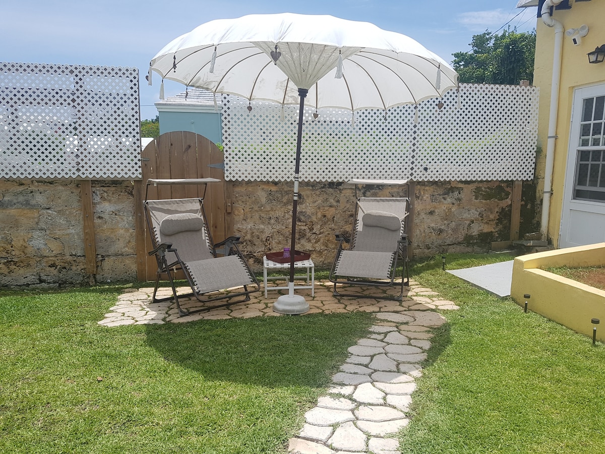 LOCATION LOCATION LOCATION (NEW LISTING). Complimentary jug of homemade rum swizzle upon arrival. Private King bedroom ensuite studio with kitchenette. We are steps away from Fourways Inn restaurant and a few further steps away from Four Star pizza takeout. 5 minute walk to the ferry stop that will take you to Hamilton or a 3 minute walk to the bus station that will take you to Hamilton or to Dockyard. Walking distance to grocery store and the railway trails that are a lovely walk.