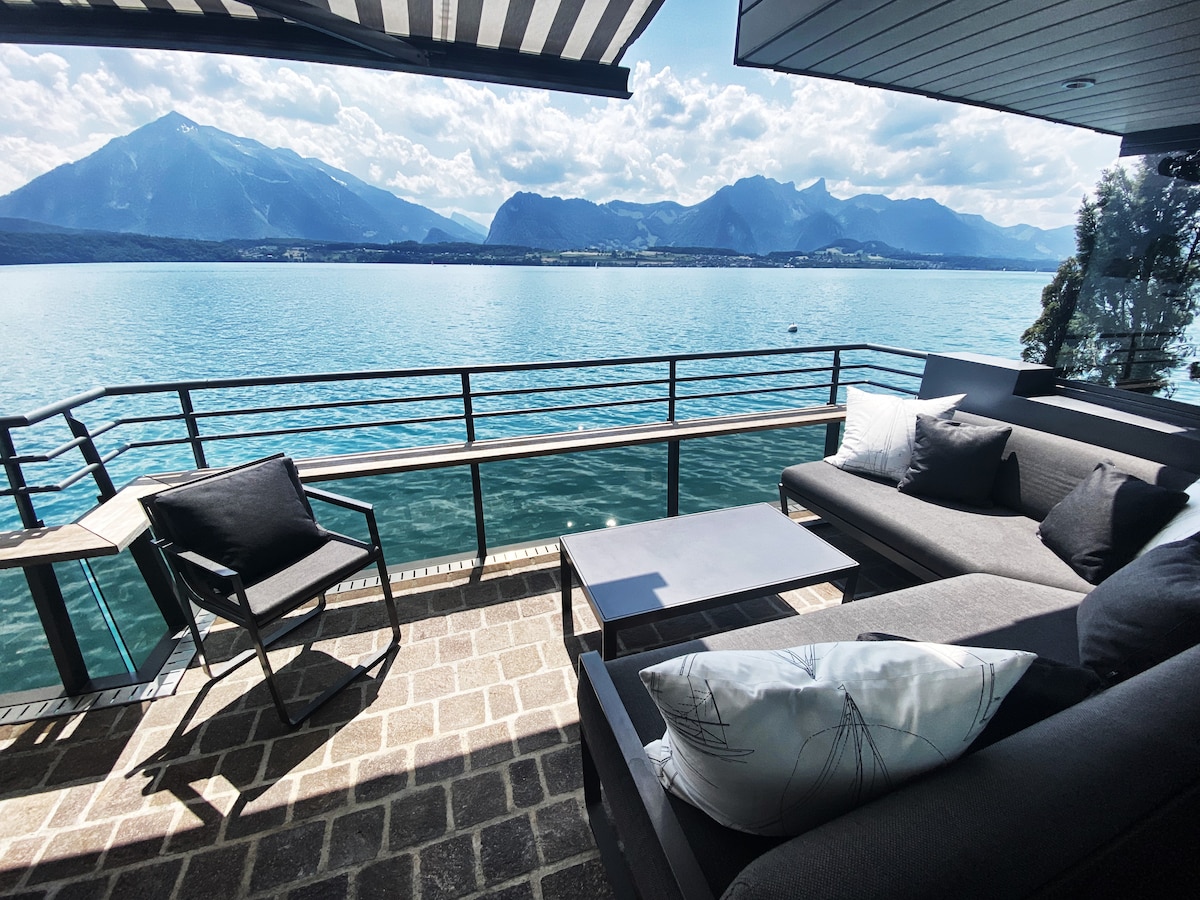 Award-winning jewel on the lake of Thun. Newly built, architecture award-winning house on the lake. Boat-like experience with views of the Bernese Overland mountains Niesen, Stockhorn, Eiger Munch and Jungfrau mountains. Perfect for a romantic getaway or a small family holiday. The living room, balcony, kitchen and bathroom are located on the lower level. 2 bedrooms are located at the mezzanine level. The outside terrace is directly on the water oriented to the south. 15min drive to Thun.