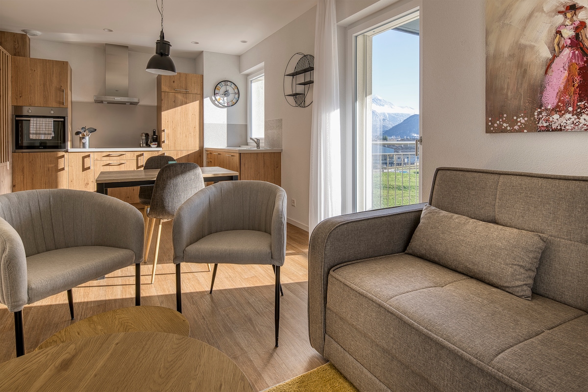 The completely new and exclusive holiday apartments of the Victoria Alpine Park are situated in the centre of Kandersteg, directly by the Hotel Victoria Ritter. The apartments have a very generous eating and living area with open kitchen, 1 bedroom and 1 bathroom. The outfit satisfies the highest expectations and the furnishing is elegant and stylish. A fully equipped kitchen with a ceramic hob, oven, dishwasher, fridge and deep-freezer are all at your disposal as well as a LED-flat screen TV. The Victoria Park is connected to the hotel infrastructure and indoor swimming pool through the underground garage. During Off Season the hotel infrastructure and indoor swimming-pool is not available.