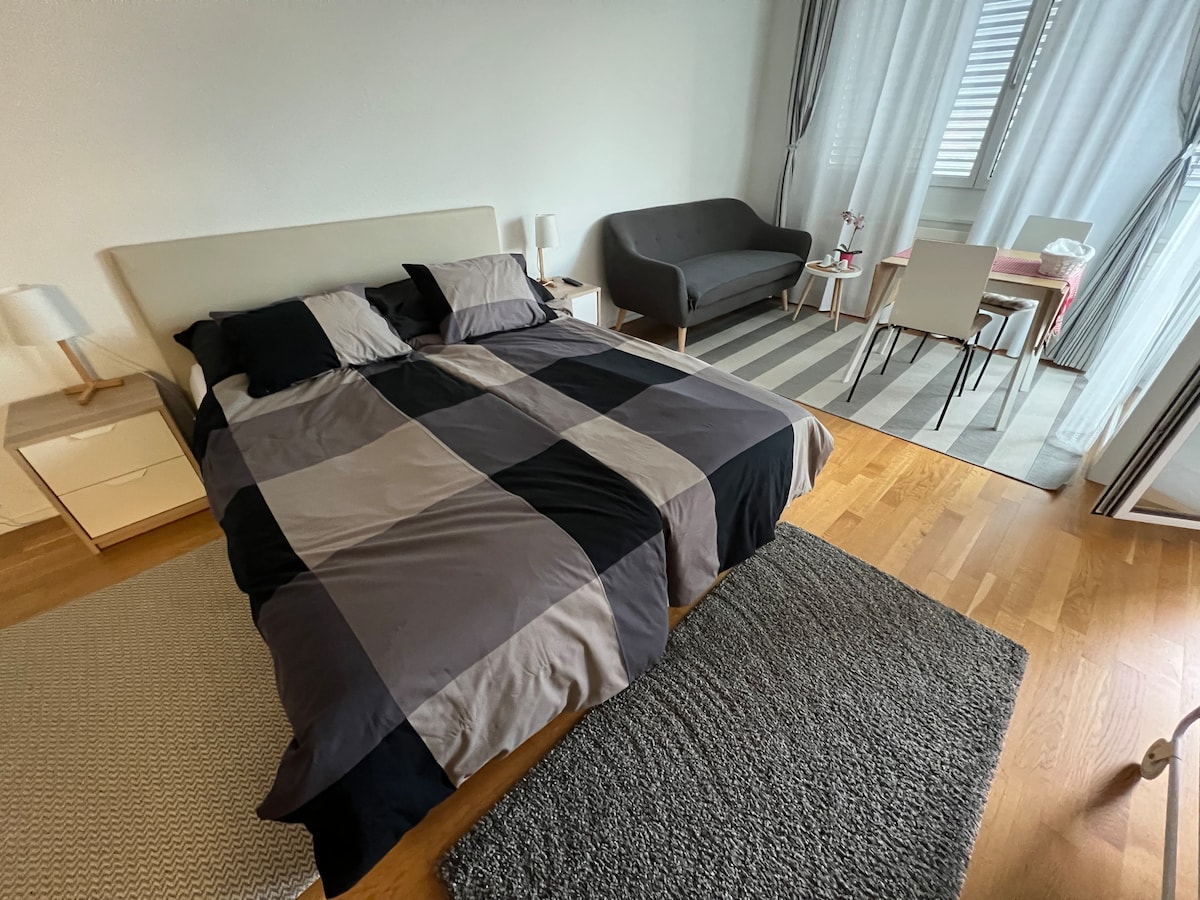 Du mietest ein neu renoviertes, modernes Studio Apartment mit neuer (kleiner) Küche mit Kühlschrank, Backofen, Geschirrwaschmaschine, Dusche/WC, TV, Internet/WLAN, Balkon, Holzparkett Boden. Das Boxspringbett (160cm) kann auf Anfrage in 2 Einzelbetten aufgeteilt werden. Sofa zum gemütlich sitzen und lesen/TV schauen. Esstisch (vergrösserbar). Alle Möbel und Ausstattung neu (2019) Du wirst eine perfekte Wohnung vorfinden, siehe Testimonials. Du mietest ein Apartment, nicht ein Hotelzimmer.