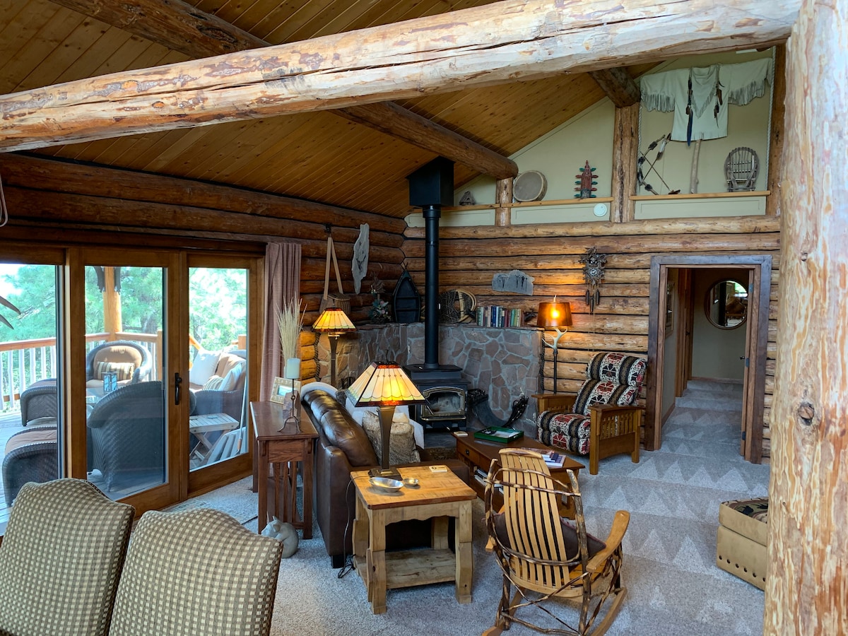 This fully equipped lodge style log home in the mountains offers the perfect blend of comfort and convenience to Albuquerque, Santa Fe and the East Mountains. Plan your vacation for hiking, trail biking, ski or just relaxation. Located at 7,000 ft elevation beneath tall ponderosa, juniper & pinon forests of the East Mountains along the Sandia Mountains and world famous Turquoise Trail, this affordable 1,500 sf log home is situated on a ridge overlooking historic Canoncito and Cedar Crest.