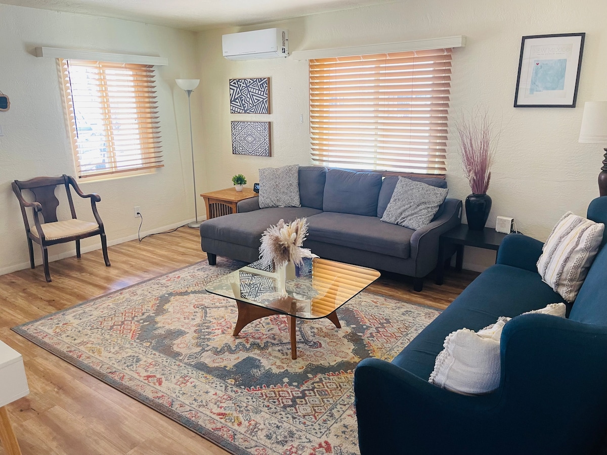 Kick back and relax in this newly renovated stylish space. The casita is themed with New Mexican charm and modern highlights. The bedroom includes a new queen sized bed and there is a fold out queen sized foam mattress in the living room as well. The dining room table seats four. The back porch is a a little oasis where you can enjoy a quiet moment or meal. Larger groups may book the house next door as well.