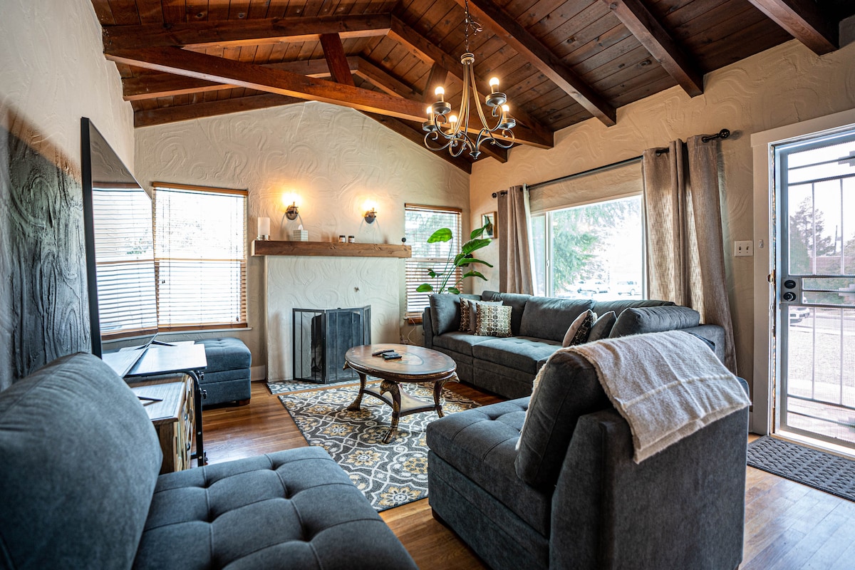 This adorable one bedroom casita features eco-friendly products, classy Deco decorating, and an extra cozy Keetsa king bed. The combination of minimal aesthetics with just the right flashy Deco touch creates a cozy, inviting interior. The Casita is completely private and is heated and cooled by mini-splits in the living room and bedroom. There is secure parking for a sedan style vehicle, but it cannot accommodate larger vehicles like large trucks or SUVs.