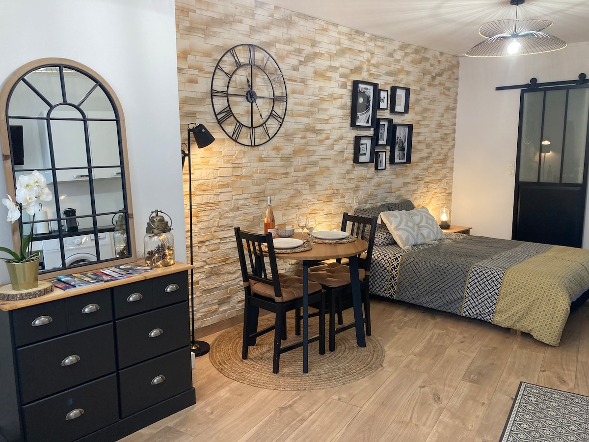 Situation : 1h30 de Paris 1h de la côte fleurie Gare de Brionne 600m Petit maison indépendante dans ma propriété comprenant au rez de chaussée espace kitchenette avec table à manger, canapé lit (2places), et wc. A l'étage salle de bain et une chambre avec 2 lits 90x190. L'escalier pour accéder à l'étage est raid donc peut être difficile pour des personnes âgées. Le logement possède des fauteuils de jardin pour profiter du petit extérieur devant le logement. J'habite à côté du logement....