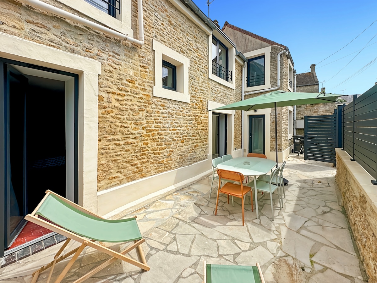 Maison refaite à neuf de 90m2 à 150m de la plage Non accessible PMR. Petite cour fermée avec terrasse sud Barbecue à disposition Commerces à proximité Bernières est une station balnéaire familiale en plein cœur des plages du débarquement Nombreux équipements aux alentours: école de voile, piscine, mini golf, centre équestre, skate Park, musées 2ème guerre Place à 2 voitures devant portillon Linge en supplément: 10€ par lit serviettes de toilette: 5€ par pers