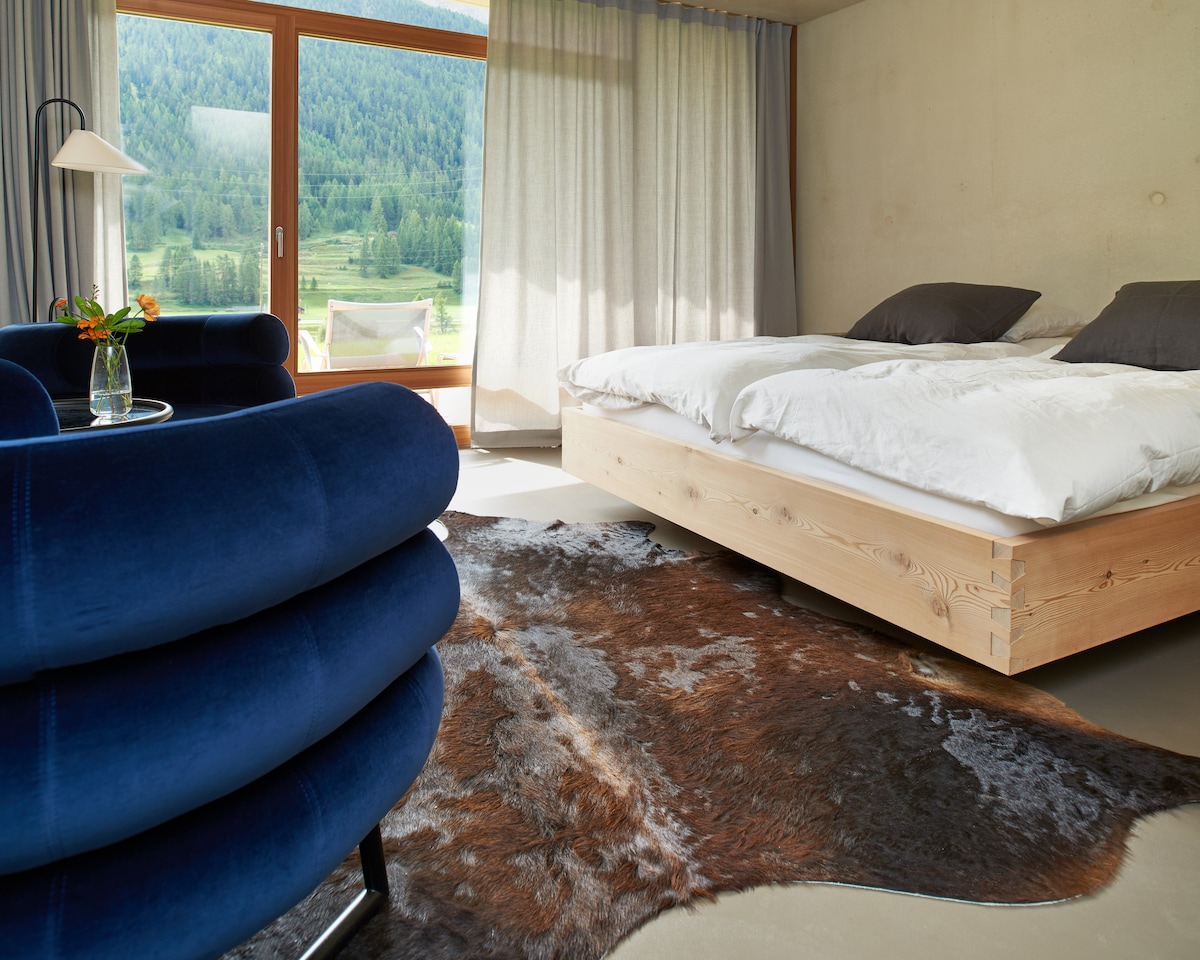 Eins von drei modernen Zimmer mit eigener Dusche/WC und privater Sonnenterasse mit unverbauter Sicht ins Tal. Frühstück ist im Preis inbegriffen und wird in der Arvenstube der Villa Marguerita serviert. Liebevoll eingerichtetes Wohn- und Lesezimmer. One out of three modern rooms with private bathroom/toilet and sun deck with view into the Engadin valley. Breakfast (in price included) is served in the main building Villa Marguerita in a traditional Stüva. Shared living room and coutyard.
