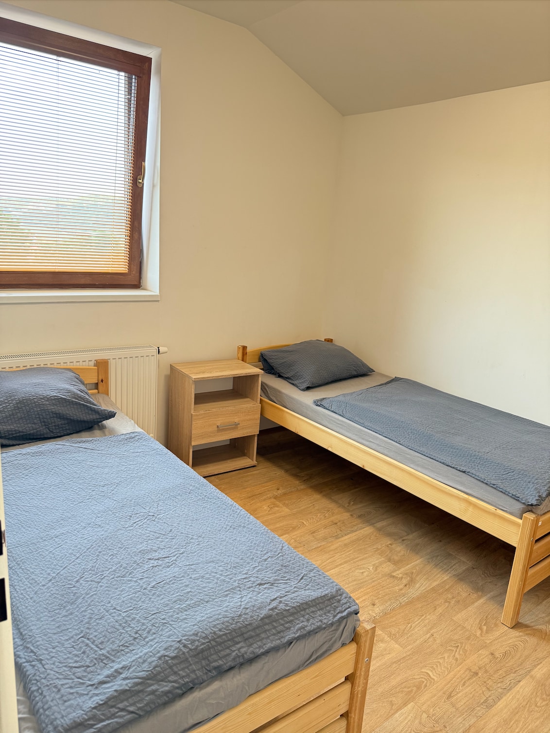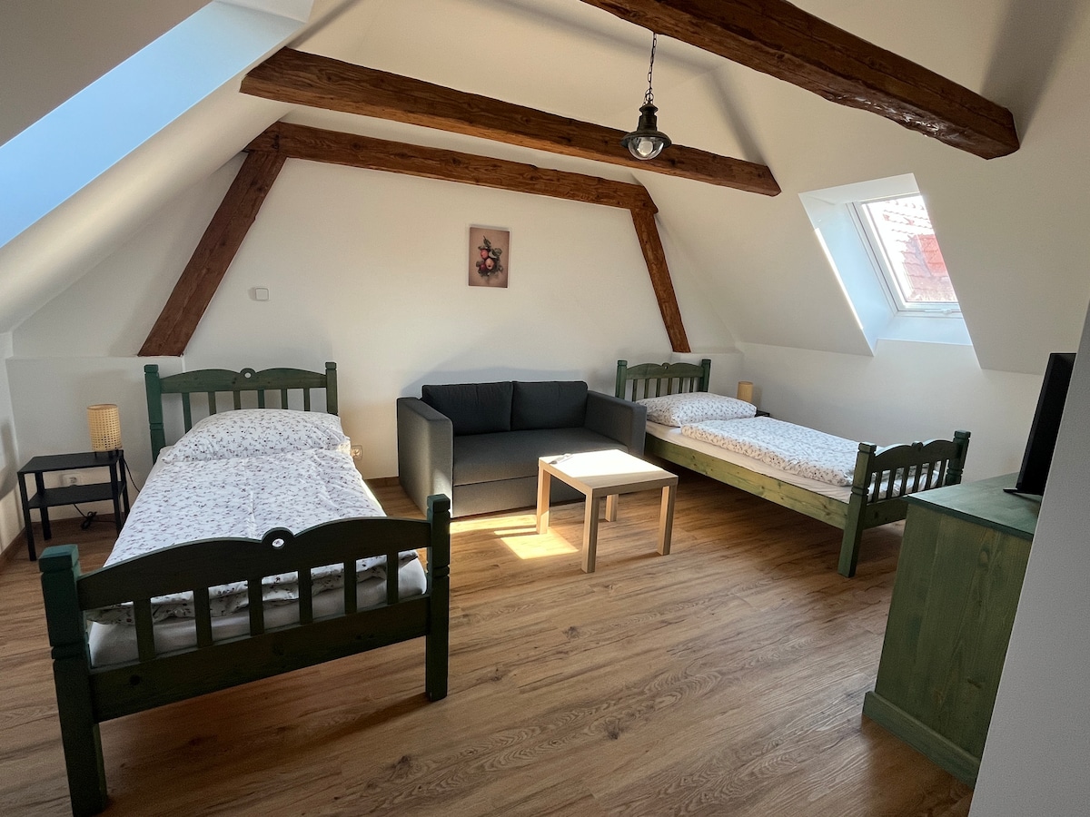 Byt je situován v horním patře rodinného domu, kde v dolním patře bude pronajímatel pro vás k dispozici. Vchody jsou oddělené pro vzájemné soukromí. Dům se nachází v klidné části rodinné zástavby. Byt má 3 ložnice po dvou lůžkách, 4. místností je obývací pokoj s rozkládací pohovkou,navíc jsou 2 matrace. V blízkosti je možné navštívit Karlštejn ( 9 km), Lom Velká Amerika ( 6 km).Velkou výhodou je, že autem jste v Praze na stanici metra Zličín za 18 minut - 12 km. V obci je golfové hřiště.