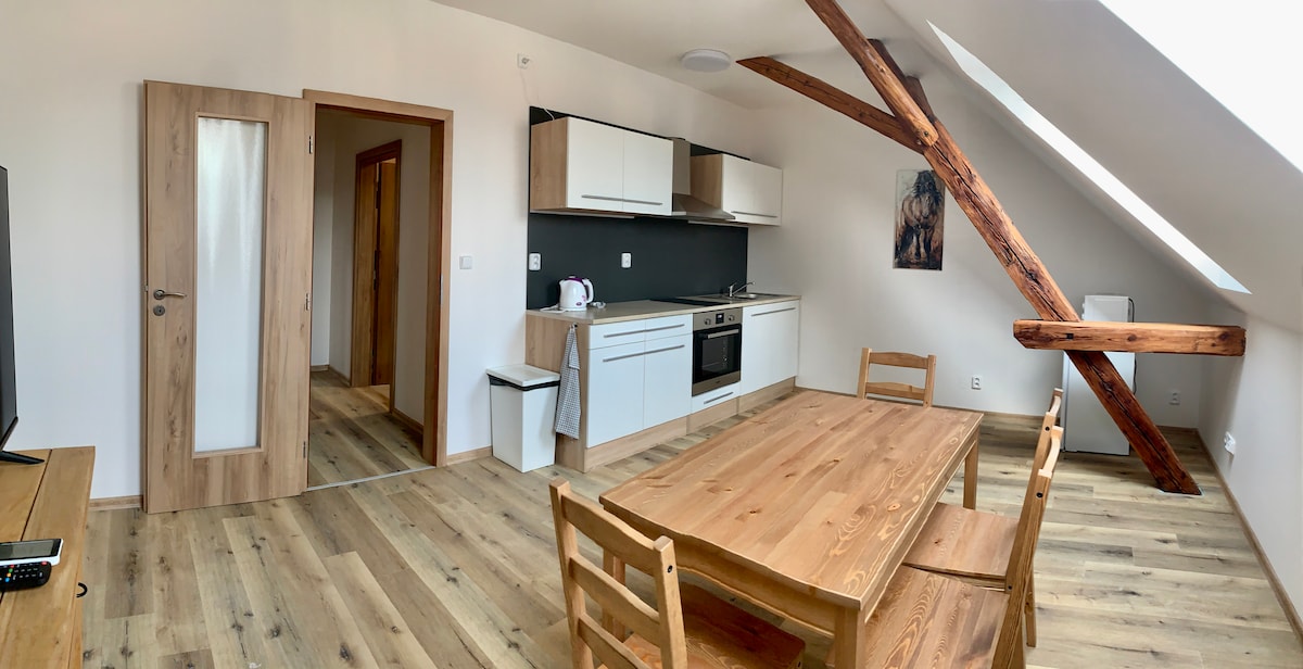 Stylový apartmán se 2 ložnicemi je ideální pro rodiny i skupiny přátel. Najdete zde plně vybavenou kuchyň, koupelnu a Wi-Fi zdarma. Klidná poloha zaručuje odpočinek, přesto s rychlým spojením do Prahy.