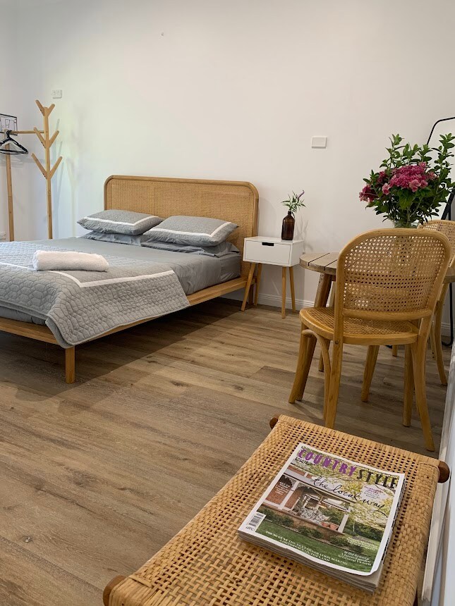 The Nest is a peaceful & private self-contained space, tucked away at the back of the property, and only a 5 minute stroll into town. All ground level, the Guest Apartment has its own private entrance, and consists of two spacious areas. The main lounge room is a large open plan space with kitchenette - including tea & coffee making facilities - then a separate generous sized bedroom with Queen bed and renovated ensuite bathroom. Pet friendly with fully enclosed fence.