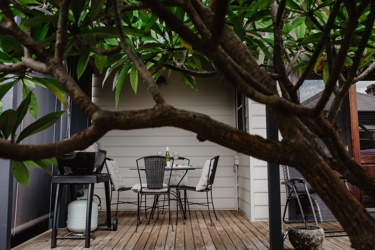 The Nest is a peaceful & private self-contained space, tucked away at the back of the property, and only a 5 minute stroll into town. All ground level, the Guest Apartment has its own private entrance, and consists of two spacious areas. The main lounge room is a large open plan space with kitchenette - including tea & coffee making facilities - then a separate generous sized bedroom with Queen bed and renovated ensuite bathroom. Pet friendly with fully enclosed fence.