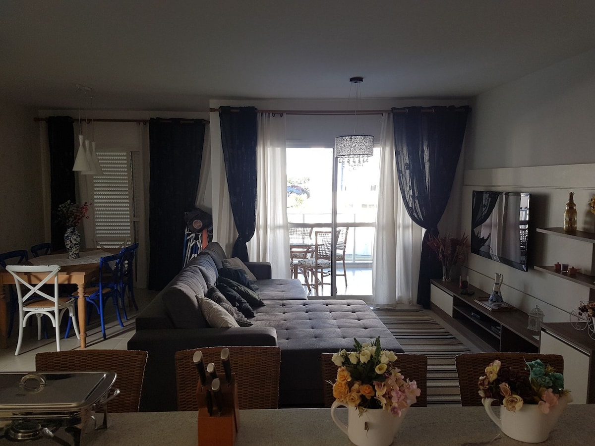 Apartamento incrível num prédio novíssimo, com decoração sofisticada e funcional. Nossa casa no inverno que oferecemos para hóspedes no verão. Ar condicionado split. WiFi 240Mb. TV 60" na sala e 35" nos quartos. Cook top, forno elétrico, microondas. Geladeira e freezer. Cozinha e copa totalmente equipadas. Lava louça, Lavadora / seca roupa. 1 suite com cama Queen e um quarto com banheiro e duas camas box. Varanda gourmet fechada com vidro, com churrasqueira e geladeira extra de bebidas.