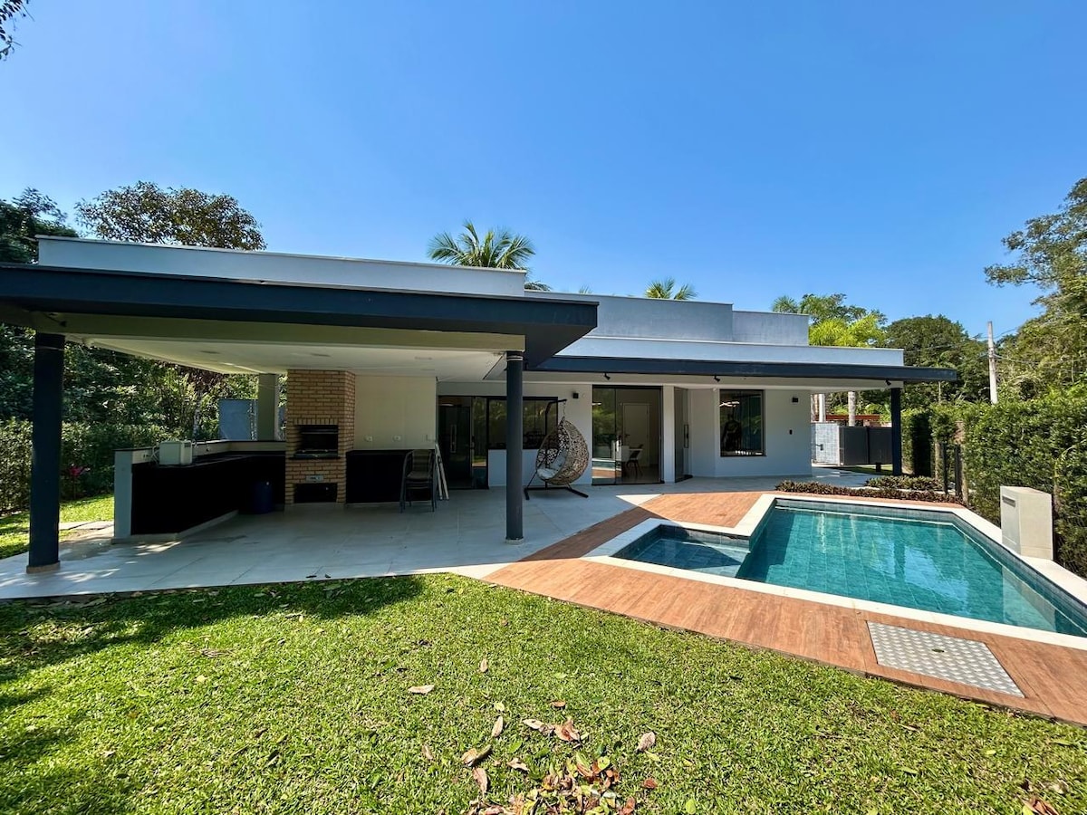Casa a poucos metros da praia de Guaratuba, dentro de condomínio com segurança 24 horas. Charmosa, recém reformada, com todos os equipamentos e mobiliários novos. São 3 suítes com ar condicionado (2 no térreo e 1 no piso superior), sala de estar, cozinha integrada à sala de jantar, área externa coberta com churrasqueira e piscina, tudo em meio à mata atlântica. Guaratuba é uma praia tranquila mesmo durante alta temporada, fica a 2 horas de São Paulo e 7km de Riviera de São Lourenço.