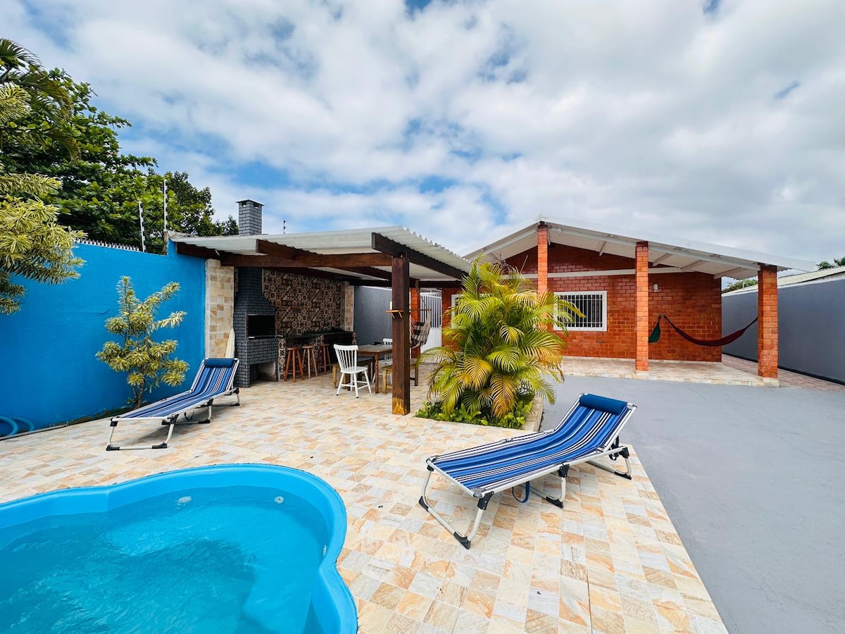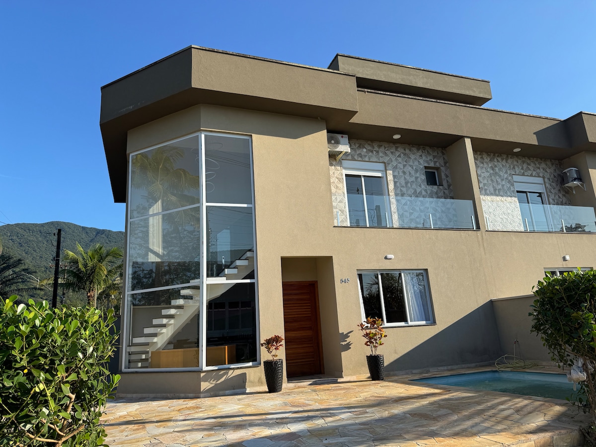 Bem pertinho da Praia (25 metros) Venha com sua família a este lugar confortável para relaxar e ouvir o som do mar *NÃO É NA RIVIEIRA* 📍 Casa situada na Praia da Enseada, no bairro Jardim das Canções, ao lado do SESC. ✨Rua tranquila e com pouco movimento 🏠Construção nova e moderna 🛋️Decoração aconchegante 🍽️Cozinha e churrasqueira bem equipadas 💧 Piscina com ozônio e aquecimento solar ☀️ No inverno, com sol, atinge no máximo 26°C. Profundidade: 1,40 m 🚐 Não aceitamos VANS.