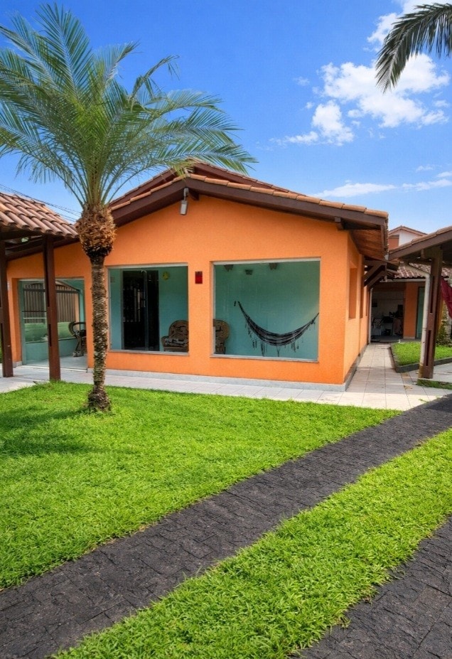 Casa a poucos metros da praia de Guaratuba, dentro de condomínio com segurança 24 horas. Charmosa, recém reformada, com todos os equipamentos e mobiliários novos. São 3 suítes com ar condicionado (2 no térreo e 1 no piso superior), sala de estar, cozinha integrada à sala de jantar, área externa coberta com churrasqueira e piscina, tudo em meio à mata atlântica. Guaratuba é uma praia tranquila mesmo durante alta temporada, fica a 2 horas de São Paulo e 7km de Riviera de São Lourenço.